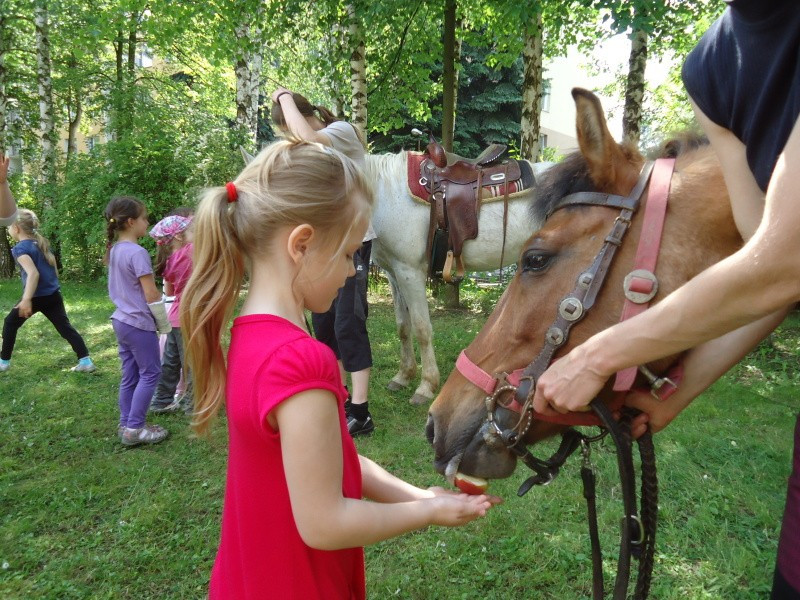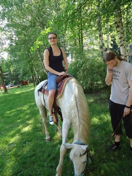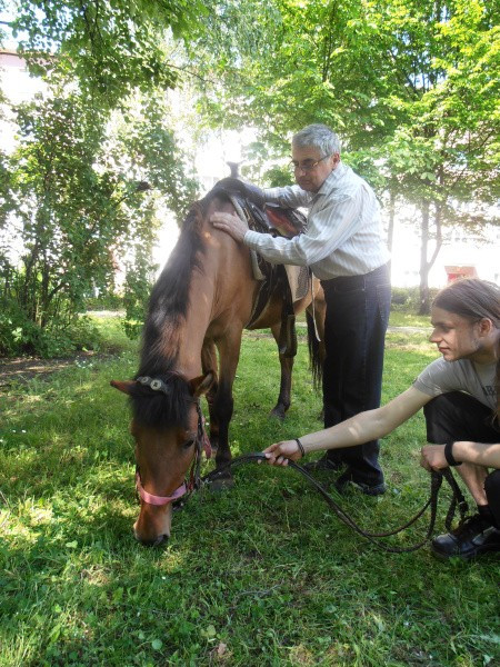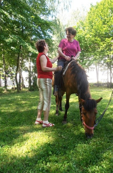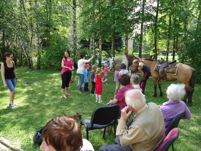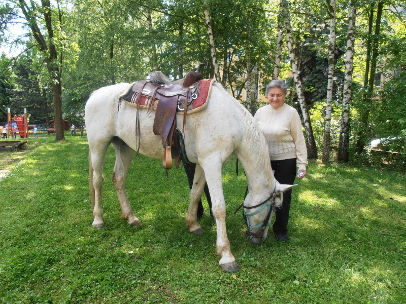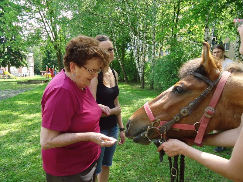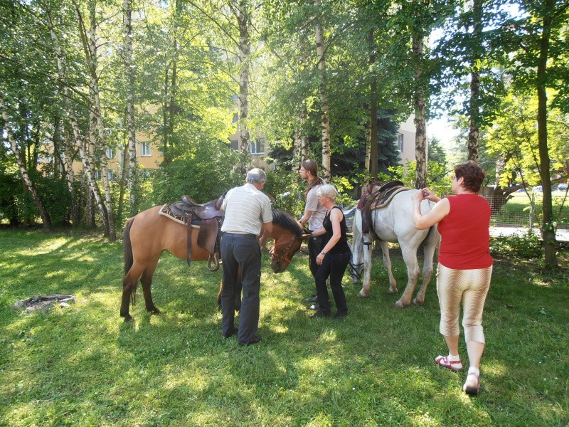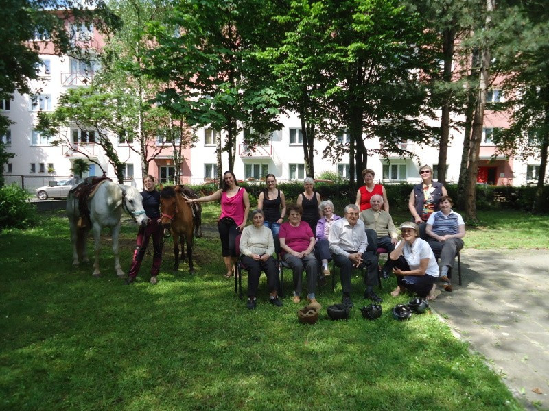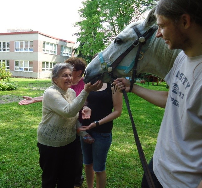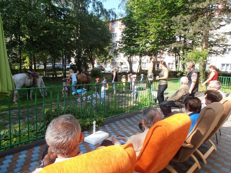 Na 21.5.2014 jsme měli spolu se sousedící mateřskou školkou naplánovanou návštěvu koní. V první části dopoledne se vozily nedočkavé děti, druhá půlka byla určena osazenstvu denního stacionáře. Po celé dopoledne senioři vnímali přítomnost předškoláků, kteří nasedali a sesedali pod verandou a pobíhali v jejich blízkosti. Nejen děti byly odvážné, ale i naši klienti se projeli, koně hladili a na závěr dostali koně za odměnu mrkev, jablko a cukr. Počasí bylo výstavní, nálada uvolněná, pokud bude zájem, sejdeme se opět na podzim.